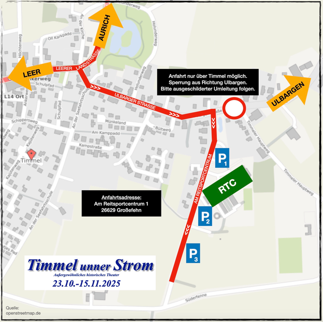 Der bisherige Arbeitstitel lautet „Timmel unner Strom“, das Stück soll im Herbst 2025 im Reitsport-Touristik-Centrum (RTC) Premiere feiern. Wegen der aktuellen Planungen der Gemeinde Großefehn die Nutzung des RTC aufzugeben, gab es eine lange Ungewissheit, ob das Stück überhaupt stattfinden kann. Aber jetzt steht das Ergebnis: JA! Der Dorfverein konnte einen Nutzungsvertrag für das RTC in Timmel unterzeichnen.